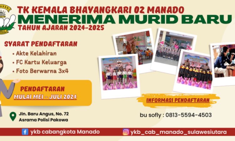 MANADO, Humas Polresta Manado – TK Kemala Bhayangkari 02 Manado kembali menggelar proses penerimaan siswa baru untuk tahun ajaran 2024-2025. Proses pendaftaran resmi dibuka pada tanggal 1 Juli 2024, menandai kesempatan bagi orang tua dan wali murid untuk mendaftarkan putra-putri mereka di sekolah terkenal dengan kurikulum holistik ini, Sabtu (6/7/2024).
