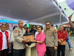 Selain bazar murah, kegiatan bakti sosial Bhayangkari 2025 juga dilaksanakan. Ny. Melanie Julianto bersama jajaran pengurus Bhayangkari membagikan paket sembako dan kebutuhan pokok kepada masyarakat yang membutuhkan.