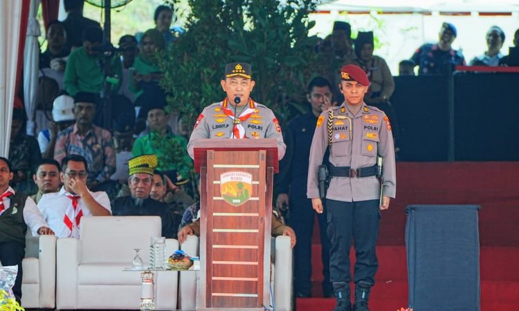 Kapolri Jenderal Listyo Sigit Prabowo menjadi Inspektur upacara pembukaan Jambore Karhutla 2025 di Bumi Perkemahan Tahura Sultan Syarif Hasyim, Kabupaten Siak, Jumat (25/4/2025).