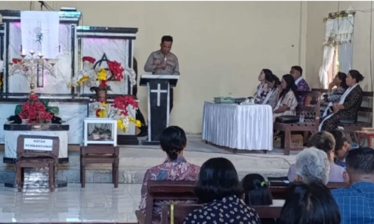 MANADO, Humas Polresta Manado – Sat Binmas Polresta Manado menggelar kegiatan himbauan dan penyampaian pesan Kamtibmas kepada jemaat Gereja GMIM Bukit Zaitun, Desa Talawaan Bantik, Kecamatan Wori. Kegiatan ini berlangsung di sela-sela ibadah Minggu pagi sebagai upaya membangun kesadaran dan menjaga ketertiban di lingkungan masyarakat setempat, Minggu (18/5/2025).