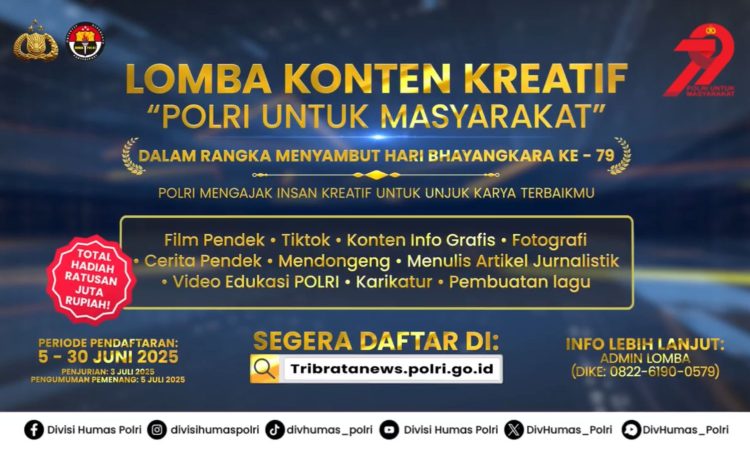 Jakarta. Ribuan peserta telah mendaftar dalam Lomba Konten Kreatif Polri yang diselenggarakan dalam rangka memperingati Hari Ulang Tahun (HUT) Bhayangkara ke-79. lomba tersebut diselenggarakan dengan mengusung tema “Polri Untuk Masyarakat”.